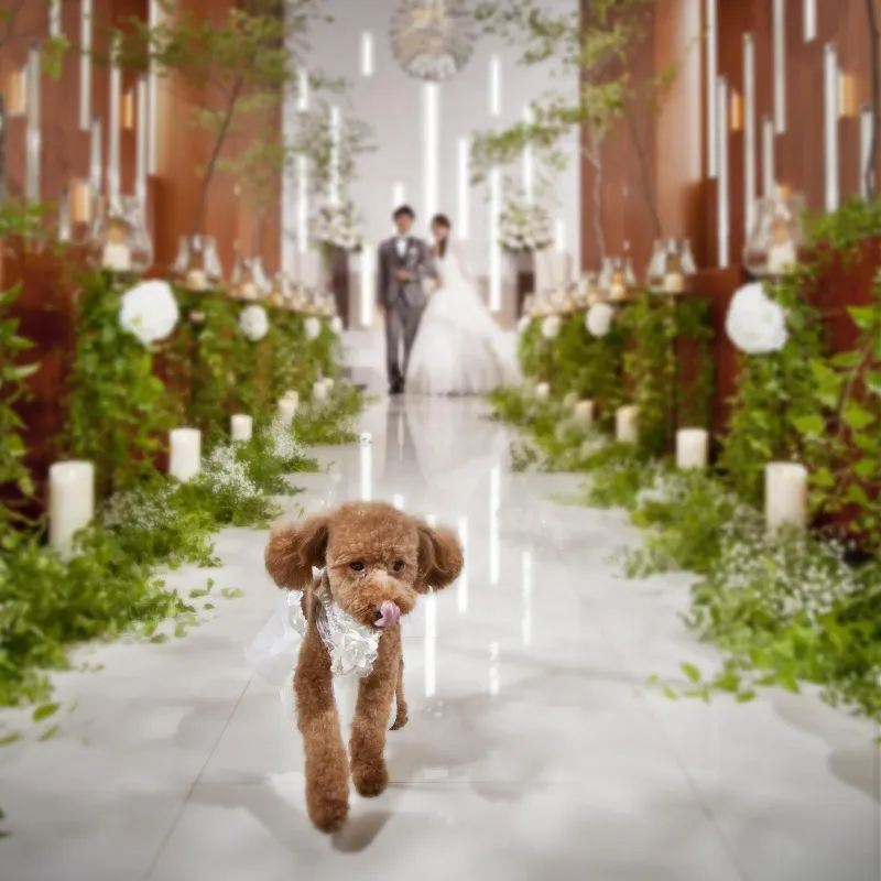 街中に佇む好立地。木の温もりに包まれた独立型チャペルで大切なペットと一緒に誓いのセレモニーが叶う。大切な瞬間を、ふたりの家族の一員でもある愛犬に見守ってもらえます。